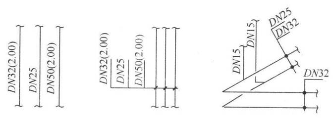 6、水平管道的规格宜标注在管道的上方;竖向管道的规格宜标注在管道的左侧。双线表示的管道,其规格可标注在管道轮廓线内。